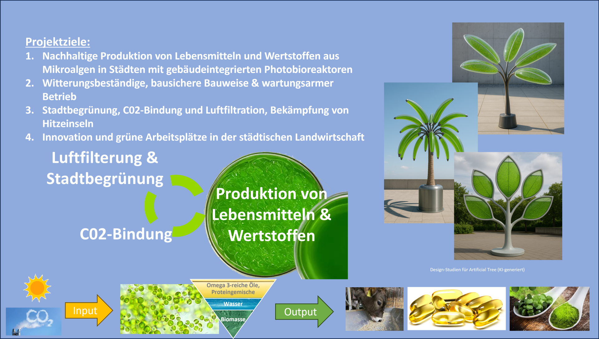 Kernidee dieses Projektes ist die Integration von PBR in Stadtmöbel (Sitzgruppen, Wartehäuschen bzw. Digitale Anzeigetafeln (Digital Signage) als künstliche Bäume „ArtificialTree“ auf Basis von Mikroalgen, um die die ökologischen und ökonomischen Potentiale der Mikroalgenkultivierung in den urbanen Raum bringen. Darüber hinaus zielt das Projekt darauf ab, die Hitzeinseln in Städten entgegenzuwirken und so auch zur Energieeffizienz urbaner Räume durch Einsparung von Klimatisierungsgeräten. Die innovativen Artificial-Algea-Tree-Elemente werden einer Mikroalgenflüssigkeit durchströmt und ermöglichen die effektive Bindung von CO₂, die Reduktion von Feinstaub und die Produktion von wertvollen Biomaterialien, wie Algenpulver als Nahrungsergänzungsmittel. Hierfür haben die Fähigkeit der Mikroalgen genutzt, CO₂ zehnmal effizienter durch die Fotosynthese zu binden als höhere Pflanzen und gleichzeitig Feinstaub aus der Luft zu filtern, und diesen als Nähr- und Mineralstoff für das Algenwachstum zu nutzen.