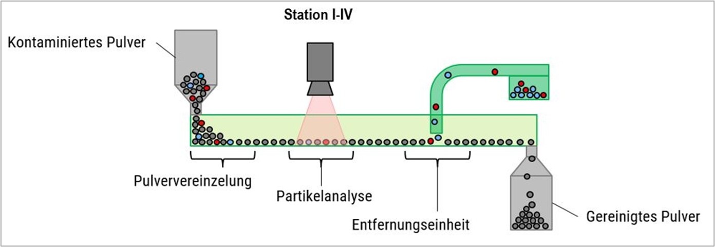 Metallbasierte Technologien für die additive Fertigung, wie bspw. das Selektive Laserschmelzen (SLM) sind in der Lage, hochleistungsfähige Teile mit enormer geometrischer Komplexität und vergleichbaren Eigenschaften wie bei der konventionellen Fertigung herzustellen. Der Schlüsselfaktor für stabile Materialeigenschaften ist die Qualität des verwendeten Pulvers. Aufgrund der vielen manuellen Schritte in der Prozesskette der additiven Fertigung besteht die Möglichkeit, dass das Pulver verschiedenen Kontaminationsquellen wie bspw. Haare, Hautschuppen, Zellulose, Textilfusseln etc., ausgesetzt wird. Insbesondere bei manuellen Eingriffen, wie dem Umfüllen von Pulver aus Behältern in die Anlage oder dem Ausräumen/Entpacken des Baubereichs, besteht die Gefahr, dass organische Bestandteile in das Pulver gelangen. Verunreinigungen reagieren im Schmelzbad mit umgebenden Elementen der vorhandenen Legierung. Es bilden sich lokal veränderte Werkstoff- und Gefügezusammensetzungen, die sich in der Regel negativ auf die mechanischen Eigenschaften des fertigen Bauteils auswirken. Moderne Siebmaschinen sind nicht in der Lage, Verunreinigungen in Größe der Partikelgrößenverteilung des Metallpulvers vollständig zu entfernen.